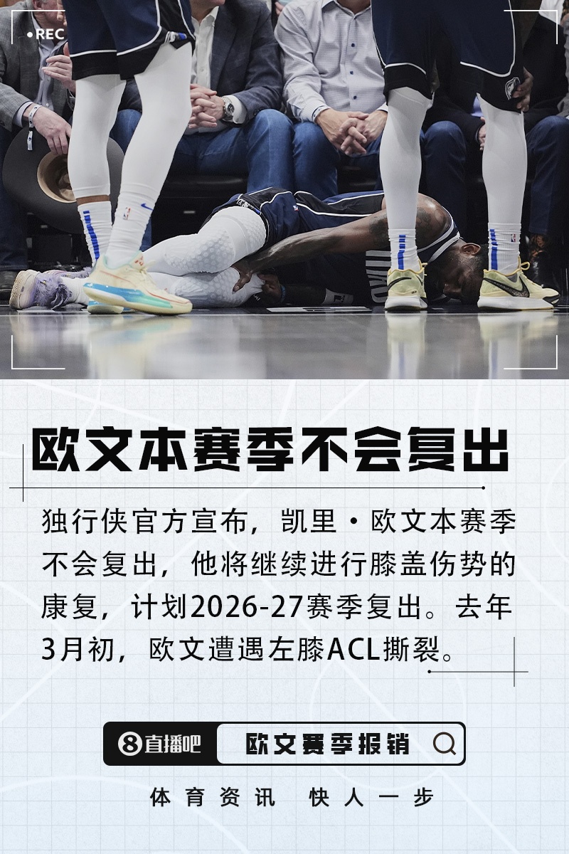 02月18日讯 独行侠官方宣布,凯里·欧文本赛季不会复出,他将继续进行膝盖伤势的康复,计划在2026-27赛季回归赛场。 去年3月初,欧文在对阵国王的比赛中遭遇左膝前十字韧带撕裂,赛季征程提前结束。 休赛期,欧文和独行侠完成续约,签下一份3年1.19亿美元的合同。