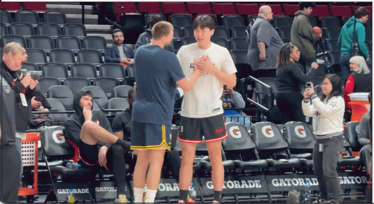 梦想成真~杨瀚森赛前和约基奇聊天拥抱合影 说好的亲一下呢
