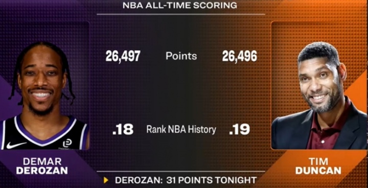 截至发稿,德罗赞本场已得到31分,生涯总分来到26497分,超越邓肯(26496分),升至NBA历史第18位! |