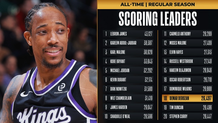 也是顶级得分手了!德罗赞生涯总分超越邓肯 升至NBA历史第18位!