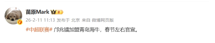02月11日讯 据媒体人苗原消息,16岁的国少前锋邝兆镭将加盟青岛海牛,春节左右官宣。随后苗原删除了该微博,并表示“算了,让俱乐部官宣吧”。