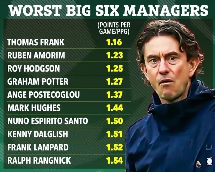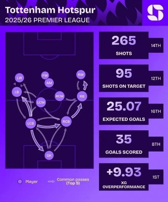 在托马斯·弗兰克执教期间,热刺在联赛中的场均得分只有1.12分(7胜8平11负),26轮后只拿到了29分。1996/97赛季的桑德兰、1999/2000赛季的温布尔登以及2010/11赛季的布莱克浦,都曾在26轮拿到29分的情况下最终降级,热刺显然是不能掉以轻心了。