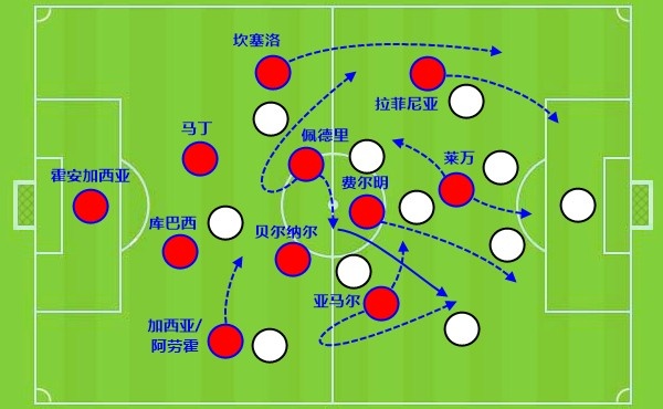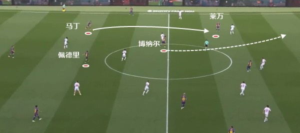 关键点还是因为有了佩德里,通过后者拖后,一来保证传球和推进的稳定性,二来也能做好攻防转换时的选位,这样一来,贝尔纳尔利用自己阅读比赛和洞察空间的能力适时前插,可以起到不错的效果。 尤其是贝尔纳尔前插串联球后,他有能力往边路跑。不只是射门,贝尔纳尔的传中脚法也不错。