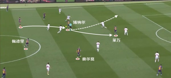 就像是这一波的进攻,贝尔纳尔在莱万和中卫之间做了一次桥梁,分球给到莱万后,他也是第一时间往侧翼跑。 虽然之后皮球没有给到贝尔纳尔这一侧,不过通过佩德里的传球找到了中路奥尔莫的机会。