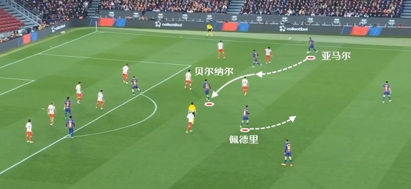 巴萨的进攻核心是佩德里和亚马尔,对手的防守重点也在他俩身上。作为角色球员,如何更好地利用他俩之间结合部的空间,就成了一门学问。 尤其是亚马尔持球从边路内切时,当佩德里向外线走,对方注意力自然会被带走,于是前顶到禁区前的贝尔纳尔就有了用武之地。