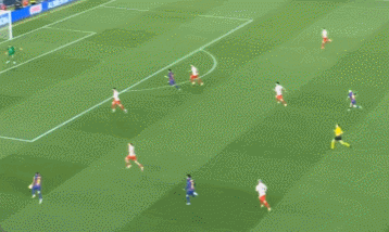 03. 弗里克着力在开发:贝尔纳尔的进攻潜力 a. 移动聪明不只是防守端:进攻端也很会跑 虽然说贝尔纳尔相比布斯克茨,他的原地控球技术有一定的差距,同时也不具备布斯克茨的身体柔韧性和做动作、传球的精度,不过贝尔纳尔的跑位意识是他最大的亮点,不只是在防守端,在进攻端同样可以跑出机会。 弗里克对于年轻人的培养是很用心的,他在比赛中也是有意识地让贝尔纳尔获得更多在进攻端的锻炼,去释放他的进攻才华,以及在门前的射门能力。